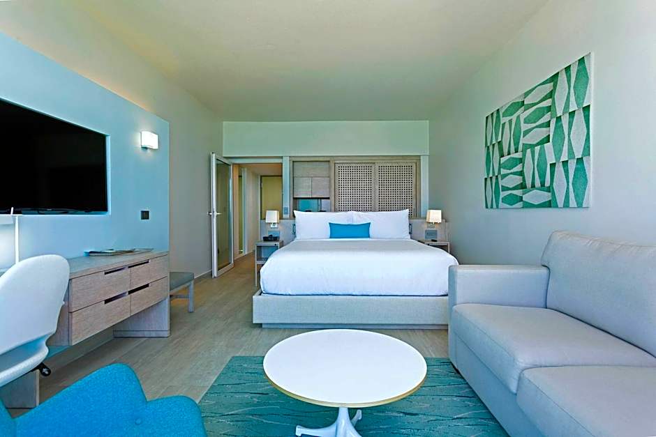 Experience the stunning ocean view from our spacious and stylish Ocean View Jr. Suite featuring a comfortable king bed, a sofa bed, and amenities such as a coffee machine, flat-screen TV, and air conditioning, providing the perfect retreat for two adults and one child.